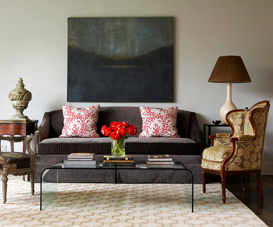 If elegant, dark tones are more your style, toss in a few bright accessories for an unexpected burst of color. In this space, red pillows and flowers pop against the cool, neutral color scheme.