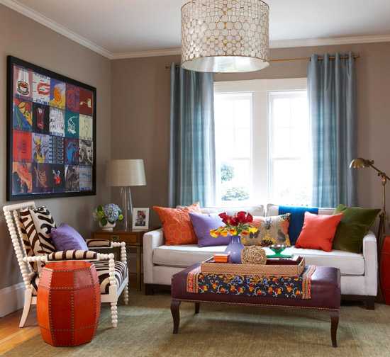 Artwork is a really great way to add color to a room. Bold and dramatic, it can magically transform your living area into a conversation piece. Stark living room with dramatic artwork does not require any other décor elements. And if you are working on a budget, then don on your creative hat. Combine thrift store finds and bargain buys into a fun, colorful gallery. To bring a little coordination to an eclectic look, carry a common color theme throughout accessories.