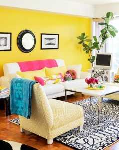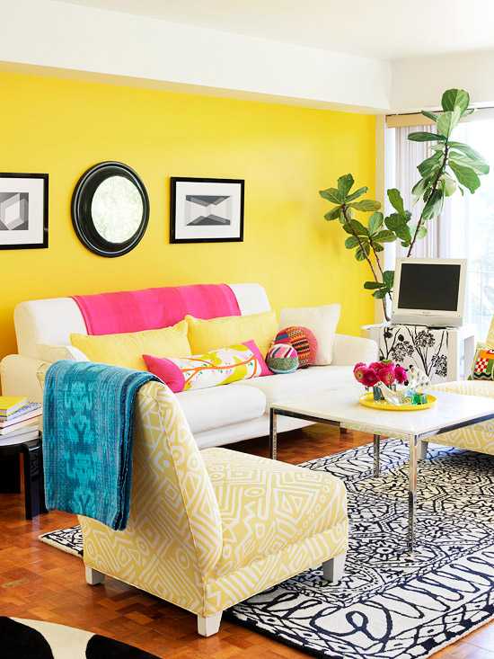Be bold and choose a primary color that makes a statement, such as this vibrant yellow. Blue and pink accessories bring lively blocks of accent colors, and a classic black-and-white area rug and artwork ensure that color doesn’t overwhelm the eye.